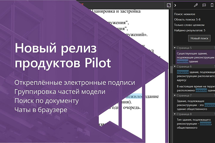 АСКОН выпустил обновление семейства продуктов Pilot, предназначенных для организации среды общих данных и инженерно-технического документооборота в строительстве. Усовершенствована методология согласования документов — теперь они подписываются откреплёнными электронными подписями. Для удобства работы с крупными BIM-моделями добавлены новые инструменты в настольных и веб-редакциях.