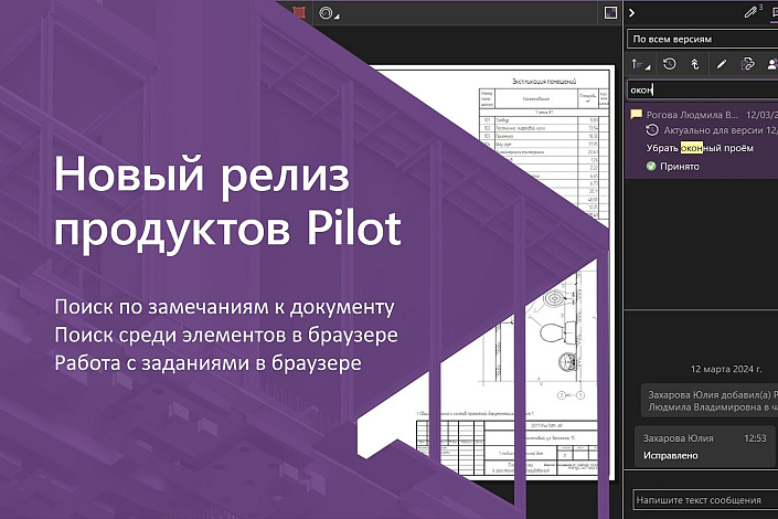 АСКОН выпустил обновление систем Pilot-BIM и Pilot-ICE Enterprise для организации среды общих данных инвестиционно-строительных проектов. Пользователи получили инструменты быстрого поиска нужных данных: замечаний к документам, документов и папок в браузере. Web-редакции стали ещё ближе к desktop-редакциям по функциональности, а вместе с ними возросли возможности для работы в среде Pilot с мобильных устройств и на отечественных операционных системах на базе Linux.