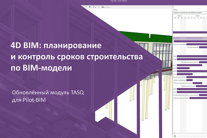 В среду общих данных Pilot-BIM интегрирована технология 4D BIM: планирование и контроль сроков строительства по цифровой информационной модели. Эту возможность предоставляет обновленный модуль TASQ от технологического партнера АСКОН, компании «КВЕРТА».