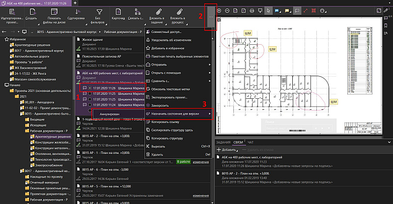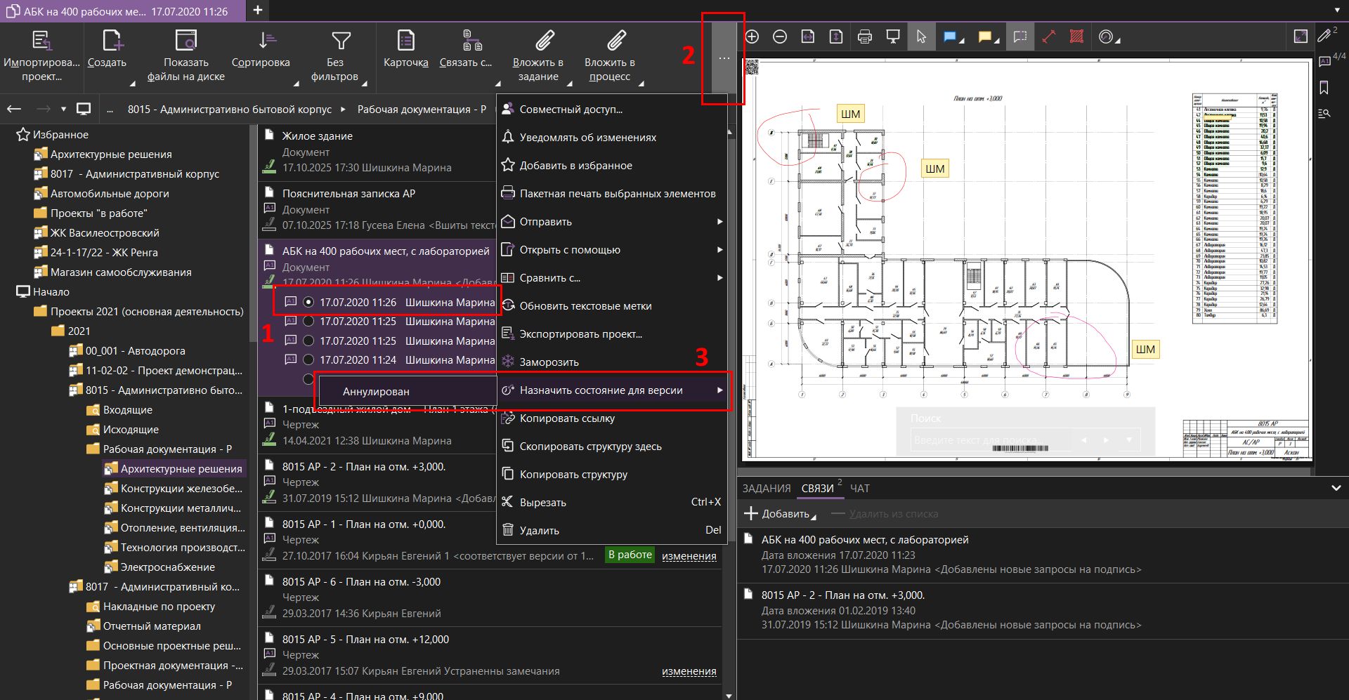 - Специалист согласует документ, его актуальная версия автоматически принимает состояние «В производство работ», а предыдущая — «Аннулировано»;
