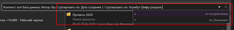 Раньше, выполнив поиск в обозревателе проектов или зайдя в умную папку (которая автоматически собирает в себе элементы, соответствующие преднастроенному поисковому запросу), пользователю необходимо было вручную искать нужный ему элемент. Теперь он может отсортировать найденные или помещённые в умную папку элементы по атрибутам, дате создания и изменения, автору, что упрощает и ускоряет работу с большим количеством найденных папок и документов.