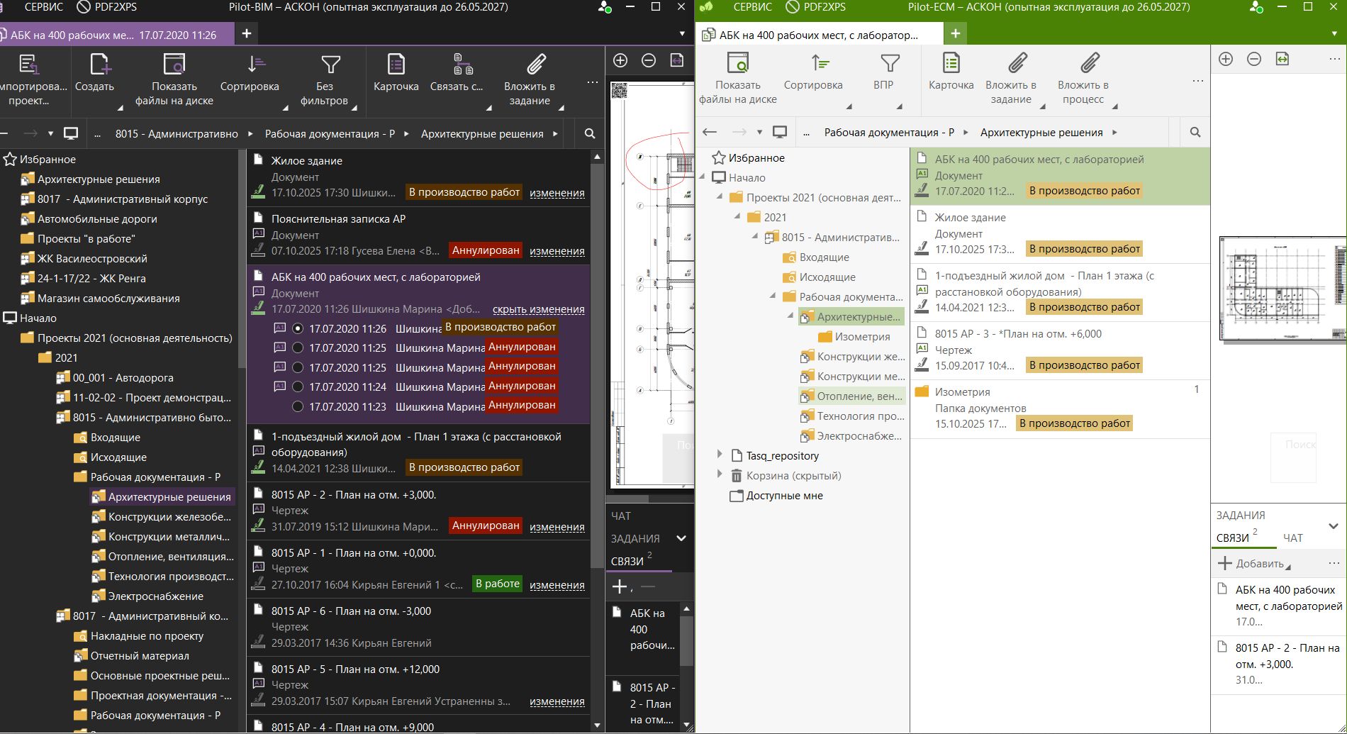 Примечание: чтобы воспроизвести подобные автоматизированные сценарии в Pilot (назначение и смена состояний при подписании, отображение разных версий у разных пользователей), после обновления выполните настройки согласно Справке (разделы Состояния версий документов и Версии документа) или обратитесь в офис АСКОН или к партнёрам.